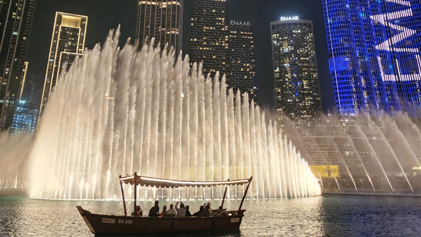 Na zakończenie czeka Cię jedno z najbardziej magicznych widowisk w Dubaju – pokaz tańczących fontann z muzyką i światłami pod Burj Khalifa.